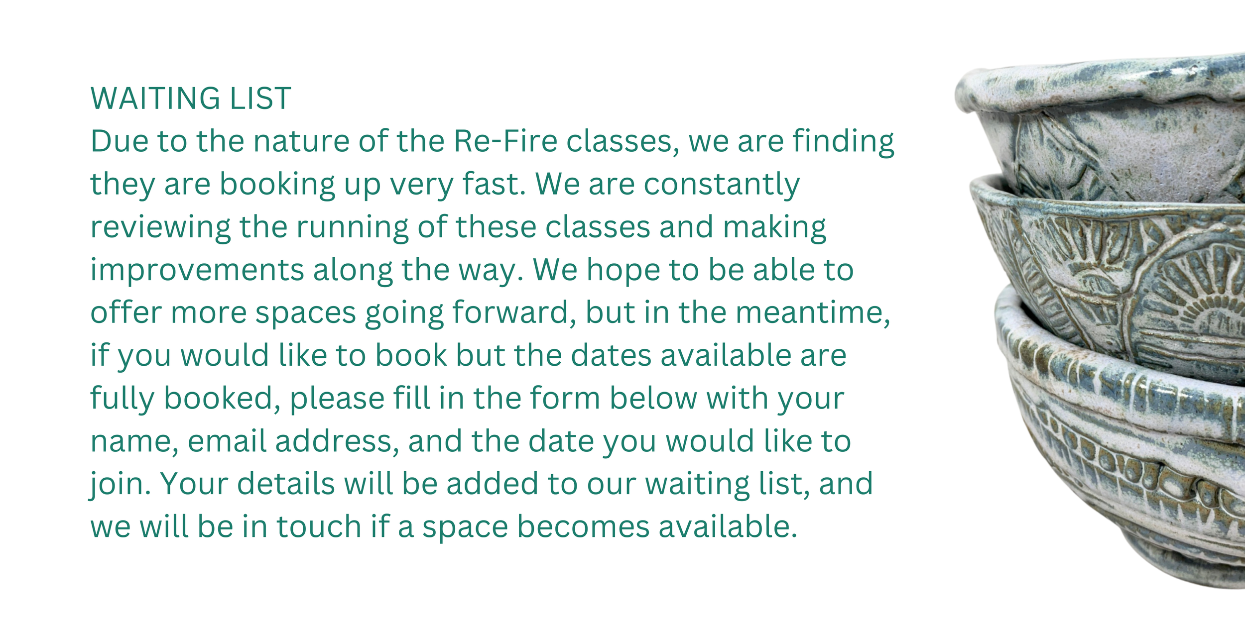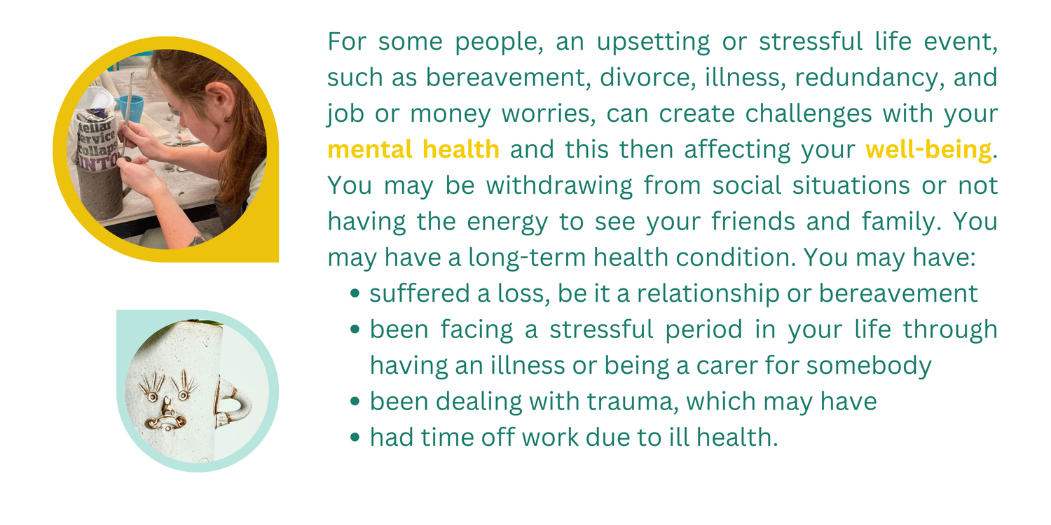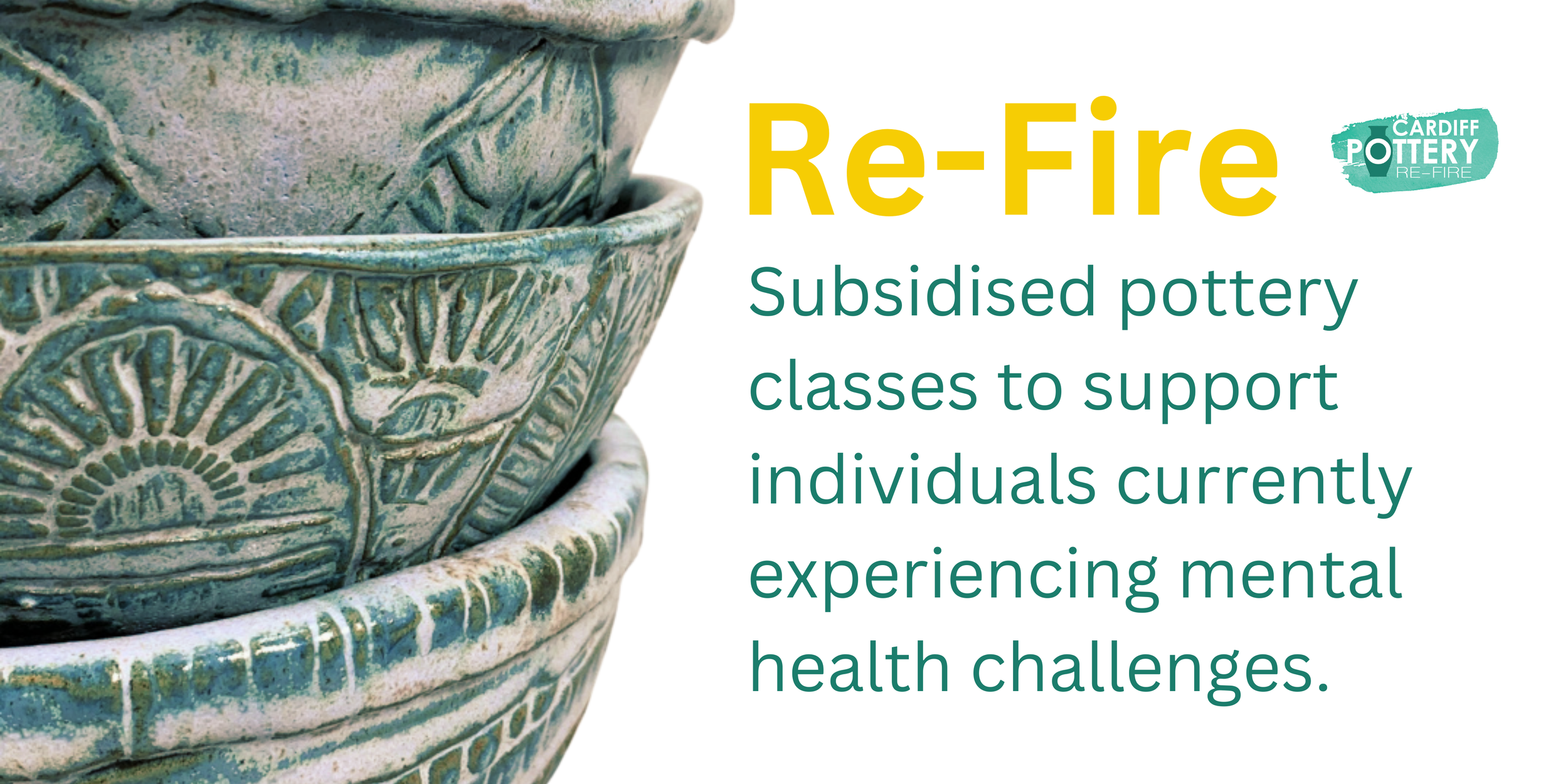 The Re Fire pottery classes on offer are run on a 6 week rotation on a Thursday evening 6.30pm-8.30pm. Re Fire spaces are limited and will be part of our 6 week Hand Building for Beginners session where you will work on a range of different pottery techniques and projects. The main aim of these workshops is to offer some solace from your mind in a friendly and supportive community. Pottery can enable you to switch off from your thoughts. Our community is kind and friendly.